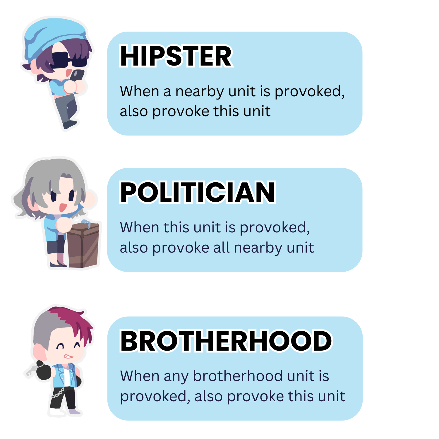 Each human unit have abilities based on their social behavior. Hipster loves to follow the latest trend, Politician do political campaign, and Brotherhood are loyal to their tribe.